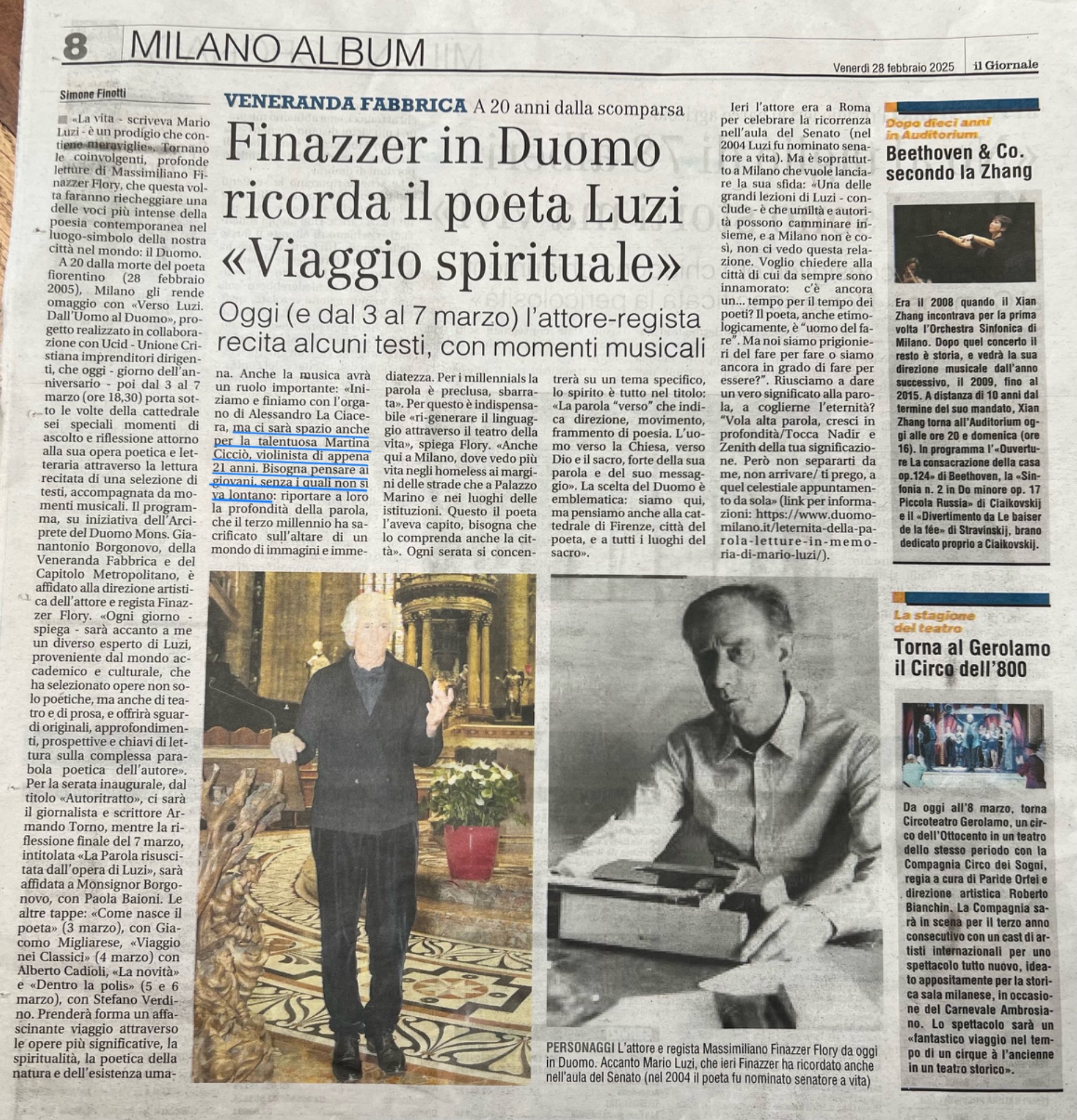 Finazzer in Duomo ricorda il poeta Luzi <<Viaggio spirituale>> … ma ci sarà spazio anche per la talentuosa Martina Cicciò, violinista di appena 21 anni. Bisogna pensare ai giovani, senza i quali non si va lontano… spiega Finazzer Flory.